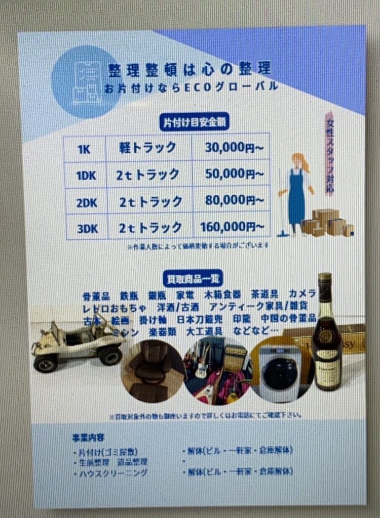 家を片付けて行く前に売りたい物や、プロに見てもらいたい物がでてきたりします。そこで弊社では骨董品の鑑定ができる方2名、家具や家電その他雑貨類の買取りが出来る方4名います。しっかりとした金額で買取りその後、片付けやハウスクリーニングなど費用がかかる事に少しでもプラスになればと考えております。買取りの専門業者、片付けの専門業者など調べてお願いするとなるとまた時間がかかってしまいます。弊社の強みでもある買取り(歴10年)片付け(歴6年)のエコグローバルにお任せ下さい。勿論、相見積もりも喜んでお伺いします。他者に負けない料金で頑張ります。